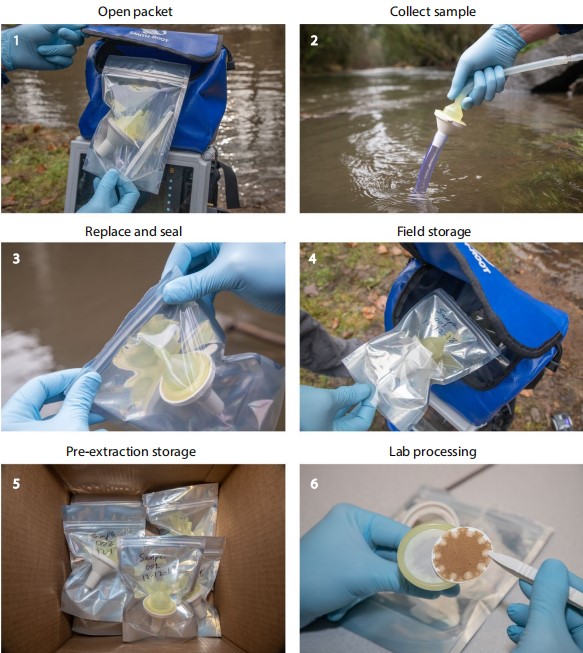 在传统的水环境DNA采样过程中,研究人员主要依赖于现场的的水样过滤及保存样品的时效性,例如低温保存、及时取出滤膜使用乙醇保存等等措施,以防止样品在运输过程中的DNA降解。然而,任何以上繁多的滤膜转移、保存步骤都会变相增加样品污染的风险,从而影响DNA检出率,且费时费力,往往在采样点货实验室浪费大量宝贵的时间。