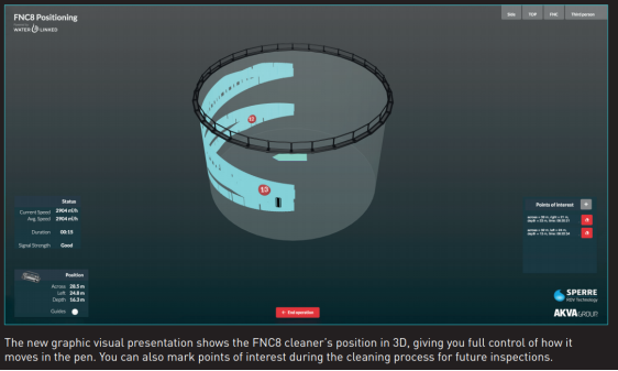 挪威FNC8网箱清洁水下机器人(ROV)的网箱清洁机可以实现在控制室中控制整个网箱清洗过程,可轻而易举地操控网箱清洁机轻柔地沿着网箱滑行,而其清洗网箱所花时间只有原来手工清洗时间的一个零头。该公司新推出的FNC8型网箱清洁机更是将对网片的磨损降低。FNC8型清洁机既不使用轮子也不使用皮带沿网爬行,确保在没有机械磨损的情况下进行仔细的清洁过程。但是,只要使用高压水,清洁网箱时就会对网箱造成一些磨损。FNC8型网箱清洁机配备了KAMAT的优质高压系统,该系统有更高的水流量,而增加水流量意味着可以降低喷水压力,达到温和清洗的效果,从而实现在不影响清洁性能的情况下将压力和磨损降低。FNC8型清洁机还集成了四个IP摄像机,操控人员能更好地监控整个网箱清洁过程。