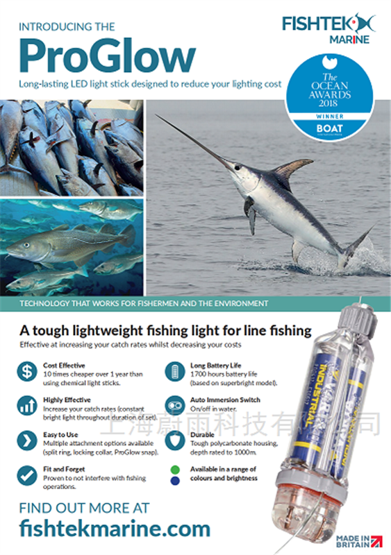剑鱼、鱿鱼等远洋鱼类有趋光性,广泛使用的化学照明棒对环境造成相当大的危害,且成本高昂。据估计,每年有7亿根重达7000吨的化学照明棒被丢弃到我们的海洋中。它们像垃圾一样冲到我们的海滩上,被海洋野生动物(如海龟)误认为是食物。Glow诱鱼灯采用了*的LED光源,寿命可达1700小时,且更换电池后即可重复使用,是一种*的无污染辅助渔业设备。
