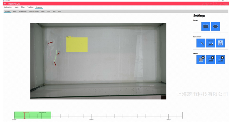 斑马鱼行为观察箱主要针对于斑马鱼仔鱼等幼鱼的行为学观察研究而设计,系统由观察箱、24(96)微孔板、红外光源、高速工业相机、高清镜头、行为分析软件组成,可以在黑暗条件下分别对多个斑马鱼仔鱼进行运动轨迹计算、活动性评估等等行为学计算。软件通过形态逻辑、色差逻辑对孔板内的研究目标进行视觉抓取,从而进行一系列行为学专业分析,数据可通过excel表格输出。