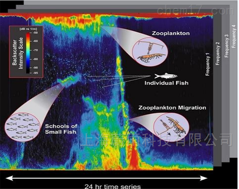 长期 声学 监测,利用声学后向散射技术监测水体中的浮游生物与鱼类,是功能强大的海洋、湖泊和河流科研和环境监测工具。使用时发射一定频率的声波,声波遇到目标物体产生回波,根据回波对水中的浮游生物鱼类进行统计研究。其中特定的频率 38KHZ 专门用于科研鱼探使用。
