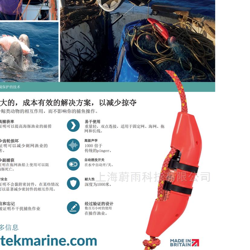 ANTI大功率驱豚仪可以产生随机且不可预测的大功率声波,可以更为有效的驱逐海豚,当海豚靠近渔网时会引起惊吓从而远离。为了达到最大效果,建议间隔100米;根据渔具、地区和海豚种类的不同,这个间隔可以有所变化。
